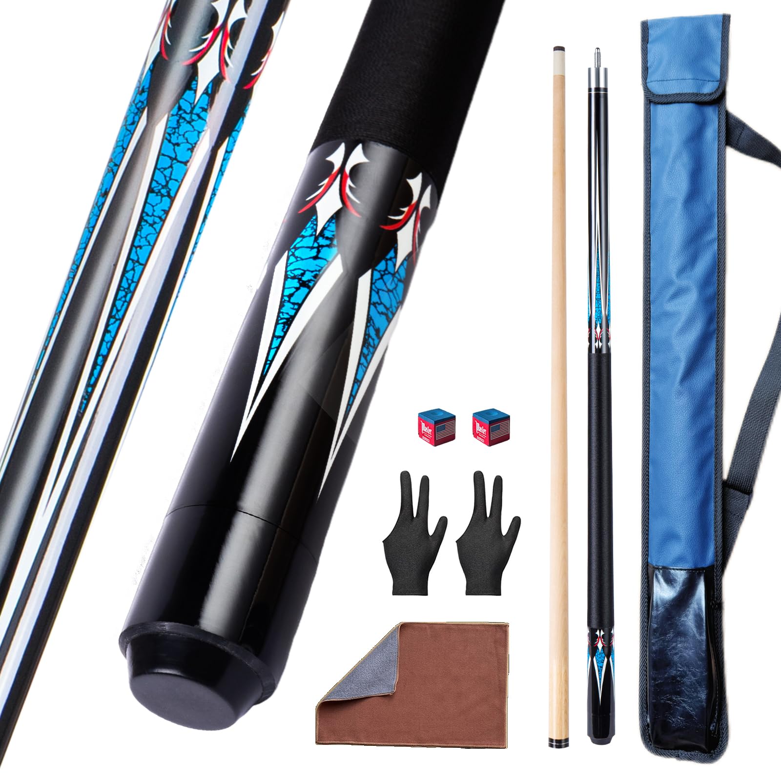 - Package: Includes 1 PCS of 58 Inch pool cue, 1 high quality leatherette cue bag,2 glove, 2 cue chalk,1 Billiard cue towel