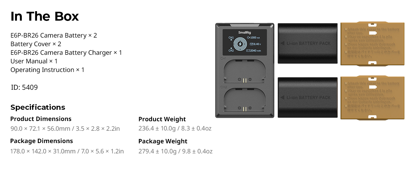 - Safety and Durability: Featuring a flame-retardant ABS+PC shell and carefully selected high-quality core chips, this Smallrig LP-E6P battery and charger set is equipped with a comprehensive protection system that prevents overheating, overcharging, over-discharging, short circuits, overcurrent, and overvoltage, thereby avoiding potential safety hazards during charging/use.