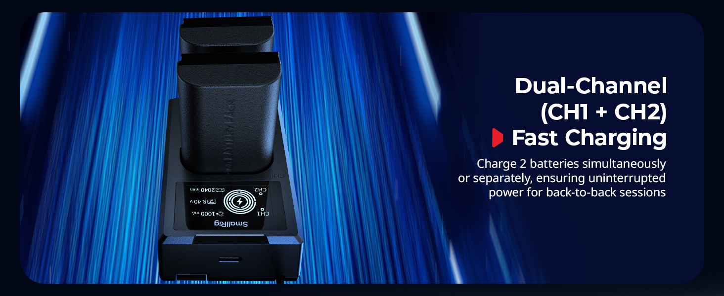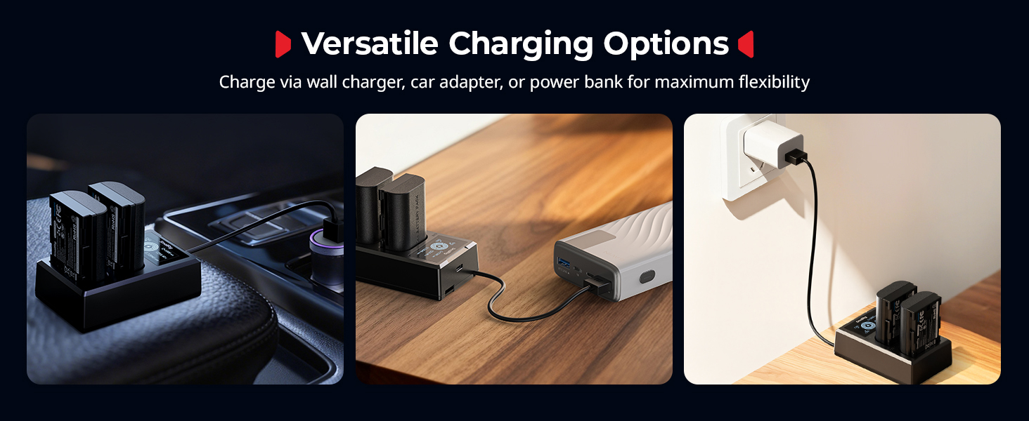- Dual-Slot Fast Charger: This USB charger supports simultaneous or separate charging of LP-E6P batteries, optimized for multi-battery configurations (supports original/SMALLRIG LP-E6P batteries). The camera battery charger set features USB ports, compatible with wall chargers, car chargers, power banks, and other power sources, enabling quick recharging during outdoor shoots and keeping your devices fully charged at all times.
