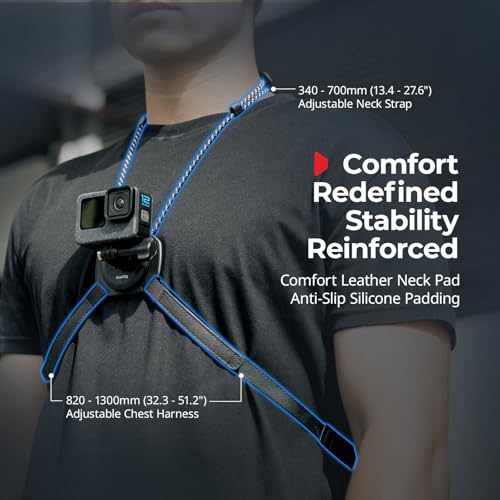 - Adjustable Quick Release Neck Support: The neck mount 5360 is compatible with action cameras or accessories featuring a two-prong adapter for GoPro. The adjustable neck strap ranges from 340mm to 700mm, while the chest strap adjusts from 820mm to 1300mm. These adjustable features cater to individual preferences, enhancing user experience and shooting results