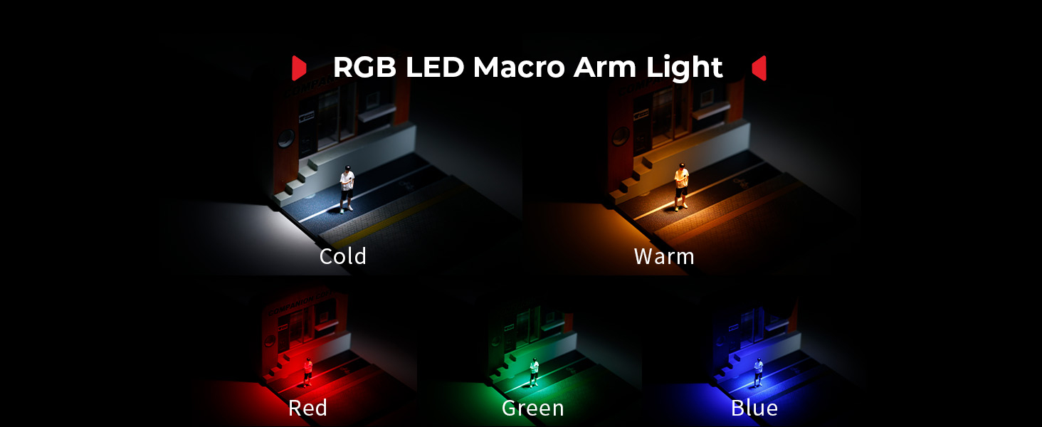 - Vivid Colors & Long Battery Life: With five 3W high-brightness LED lamps (cold white, warm white, red, green, and blue colors), CRI 95, and TLCI 92. The cold light is 6500K, and the warm light is 2200K. Change lights in moments, to suit every subject. Built with a 2000mAh rechargeable battery, it supports up to 140 minutes of runtime. No need to charge frequently, macro shooting won't be interrupted.