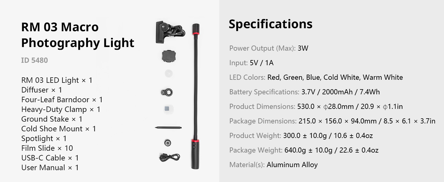 - All-in-One Macro Photography Kit: Includes the SmallRig RM 03 light, softbox, four-leaf barndoors, heavy-duty clamp, ground stakes, cold shoe mount, spotlight, 10 film slides, USB-C cable, and user manual. Ready to use straight out of the box—no complicated assembly required.