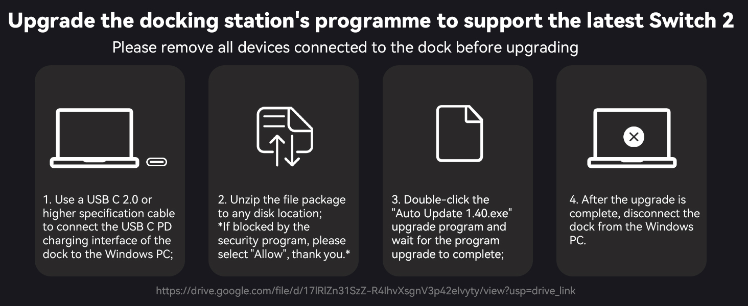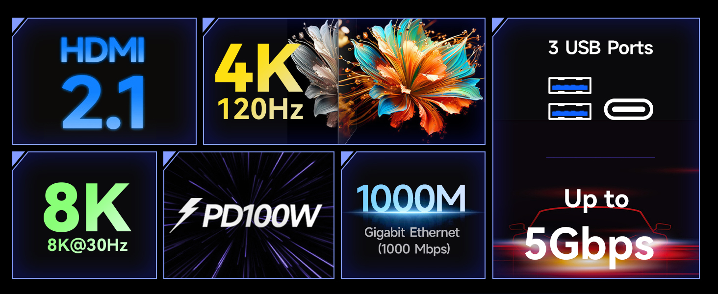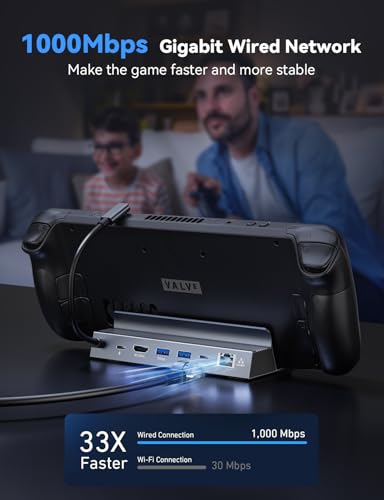 - 6-IN-1Steam Deck Dock:Steam Decking Docking Station offers 6-in-1 connectivity. The docking station features 1* 4K@120Hz HDMI 2.1 port, 1*1Gbps Ethernet port, 2*5Gbps USB-A 3.0 ports, 1*5Gbps USB-C 3.0 port and 1*100W fast charging USB-C PD3.0 port.Upgrade the docking station's programme to support the latest Switch 2, if you need to support switch 2 screen casting, please contact us for the upgrade programme.To use the Switch 2 casting function, you need to connect a GaN charger with USB C PD 3.0 65W power or higher.