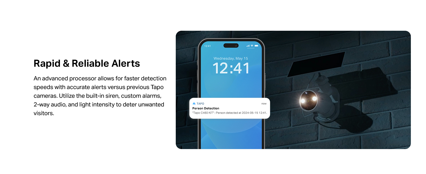 - ๐ฆ๐ผ๐๐ป๐ฑ ๐ฎ๐ป๐ฑ ๐๐ป๐๐ถ-๐ง๐ต๐ฒ๐ณ๐ ๐๐น๐ฎ๐ฟ๐บ ๐ณ๐ผ๐ฟ ๐๐ป๐ต๐ฎ๐ป๐ฐ๐ฒ๐ฑ ๐ฆ๐ฒ๐ฐ๐๐ฟ๐ถ๐๐ โ The Tapo C460 always remains vigilant; If an intruder attempts to tamper with or move the outdoor camera, an alarm will sound, and youโll receive an instant notification for quick action