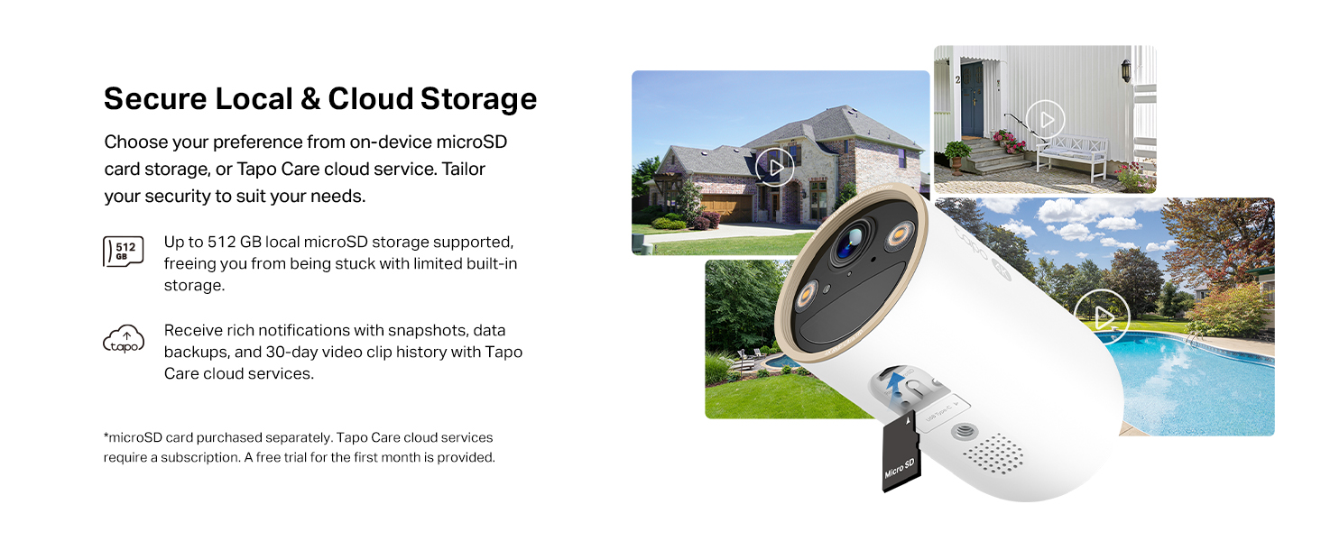 - ๐ก๐ผ ๐ ๐ผ๐ป๐๐ต๐น๐ ๐ฆ๐๐ฏ๐๐ฐ๐ฟ๐ถ๐ฝ๐๐ถ๐ผ๐ป ๐๐ฒ๐ฒ๐ โ Enjoy flexible storage options with this outdoor wireless camera; Use a microSD card (up to 512GB, sold separately) for secure local storage; Alternatively, opt for Tapo Care cloud storage with a free one-month trial for additional storage needs and more secure security; where you donโt need to worry about the SD card damages or being removed