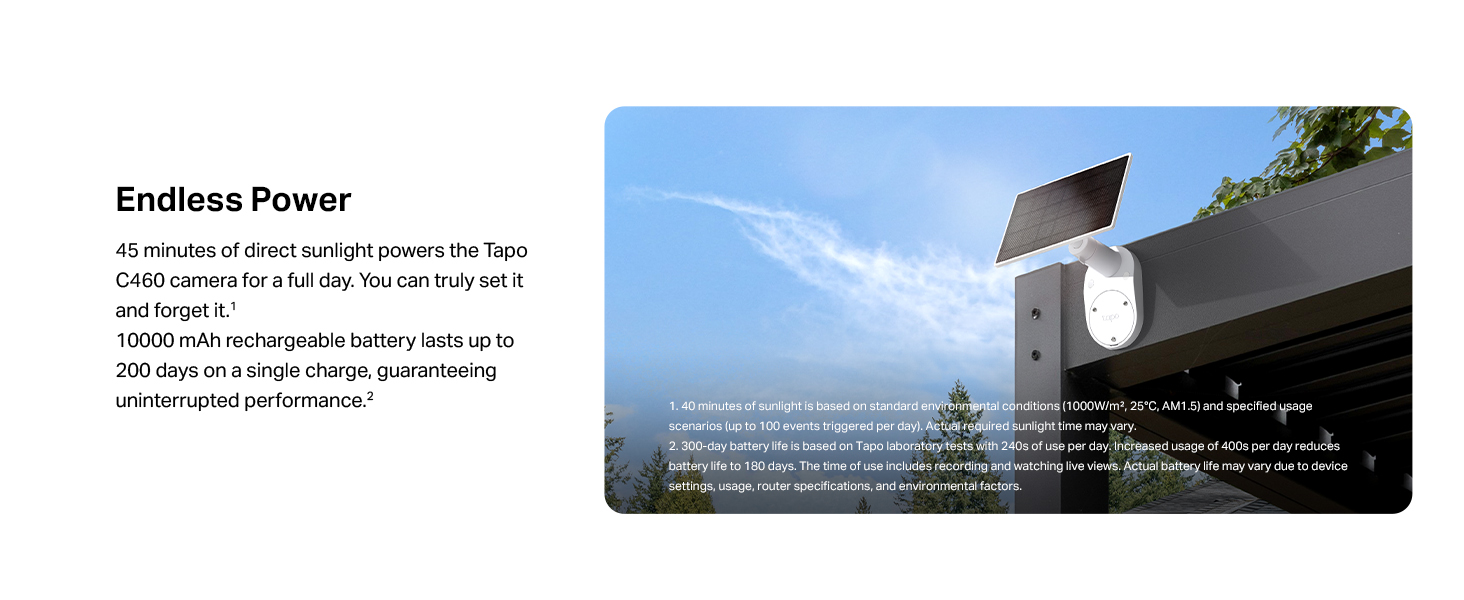 - ๐ช๐ถ๐ฟ๐ฒ-๐๐ฟ๐ฒ๐ฒ ๐๐ป๐ฑ๐น๐ฒ๐๐ ๐ฃ๐ผ๐๐ฒ๐ฟ ๐๐ถ๐๐ต ๐ฎ ๐ฆ๐ผ๐น๐ฎ๐ฟ ๐ฃ๐ฎ๐ป๐ฒ๐น ๐๐๐ง – ๐ ๐ฎ๐ถ๐ป๐๐ฒ๐ป๐ฎ๐ป๐ฐ๐ฒ-๐๐ฟ๐ฒ๐ฒ โ Effortlessly monitor your space wirelessly from any location; Just 45 minutes of direct sunlight powers the Tapo C460 for a full day; Its 10,000mAh rechargeable battery lasts up to 200 days per charge, ensuring uninterrupted performance