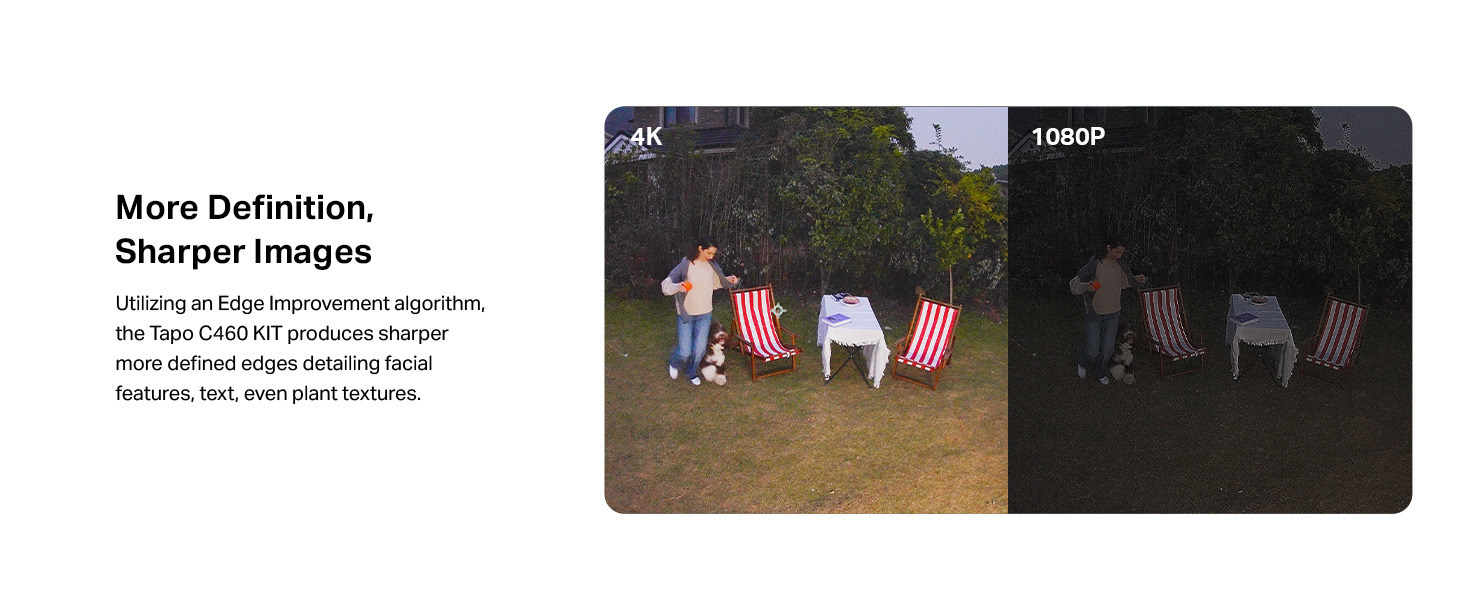 - ๐ฐ๐ ๐ด๐ ๐ฃ ๐จ๐น๐๐ฟ๐ฎ ๐๐ ๐๐ถ๐๐ฒ ๐ฉ๐ถ๐ฒ๐ ๐๐ถ๐๐ต ๐ฆ๐๐ฎ๐ฟ๐๐น๐ถ๐ด๐ต๐ ๐๐ผ๐น๐ผ๐๐ฟ ๐ก๐ถ๐ด๐ต๐ ๐ฉ๐ถ๐๐ถ๐ผ๐ป โ Tapo C460 KIT outdoor camera features 4K 8MP resolution for superior clarity with an upgraded image sensor, processor, and lens; Also includes 18x digital zoom with an F1.6 large-aperture lens for enhanced detail in every shot; The F1.6 lens, starlight sensor, and built-in spotlight enhance nighttime security by delivering clear, full-color footage