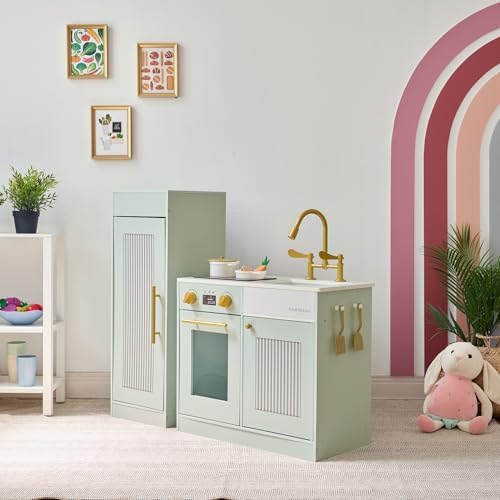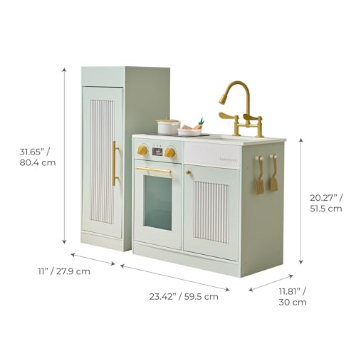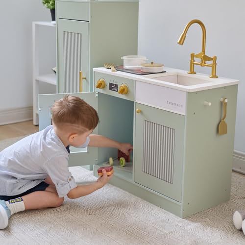 The Teamson Kids Little Chef Chester kitchen in vibrant green combines delightful style, realistic features, and practical learning all in one. Thoughtfully designed to inspire imaginative role play and teach important life skills, this kitchen set includes two versatile pieces — a stove and sink unit and a separate refrigerator — that can be placed together or apart to suit your child’s creative play needs. Kids can “cook,” clean, and organize just like grown-ups while exploring their creativity and building confidence. Realistic details like clicking knobs, generous countertops, shelves, and hooks make playtime feel authentic and engaging. The set comes complete with 12 high-quality accessories, including pots, utensils, vegetables, and tasty “treats,” so children can jump into their role as a chef right away. The rich green color adds a lively and stylish touch to any playroom, while the sturdy wooden construction ensures years of safe, durable play. Its compact design makes it suitable even for smaller rooms, offering big fun without taking up too much space. As children play, they practice teamwork, develop motor skills, and strengthen their organizational abilities. Whether hosting a pretend dinner for family, tidying up their kitchen, or dreaming up new recipes, children learn valuable social and emotional lessons while having fun. Perfect for children aged 3 and up who love to express themselves, collaborate, and discover the joy of cooking through imaginative play.