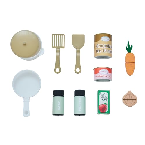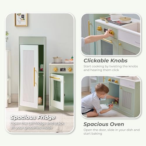- FUN: Green kitchen with fridge, stove, hooks, shelves, and 12 accessories for realistic play.