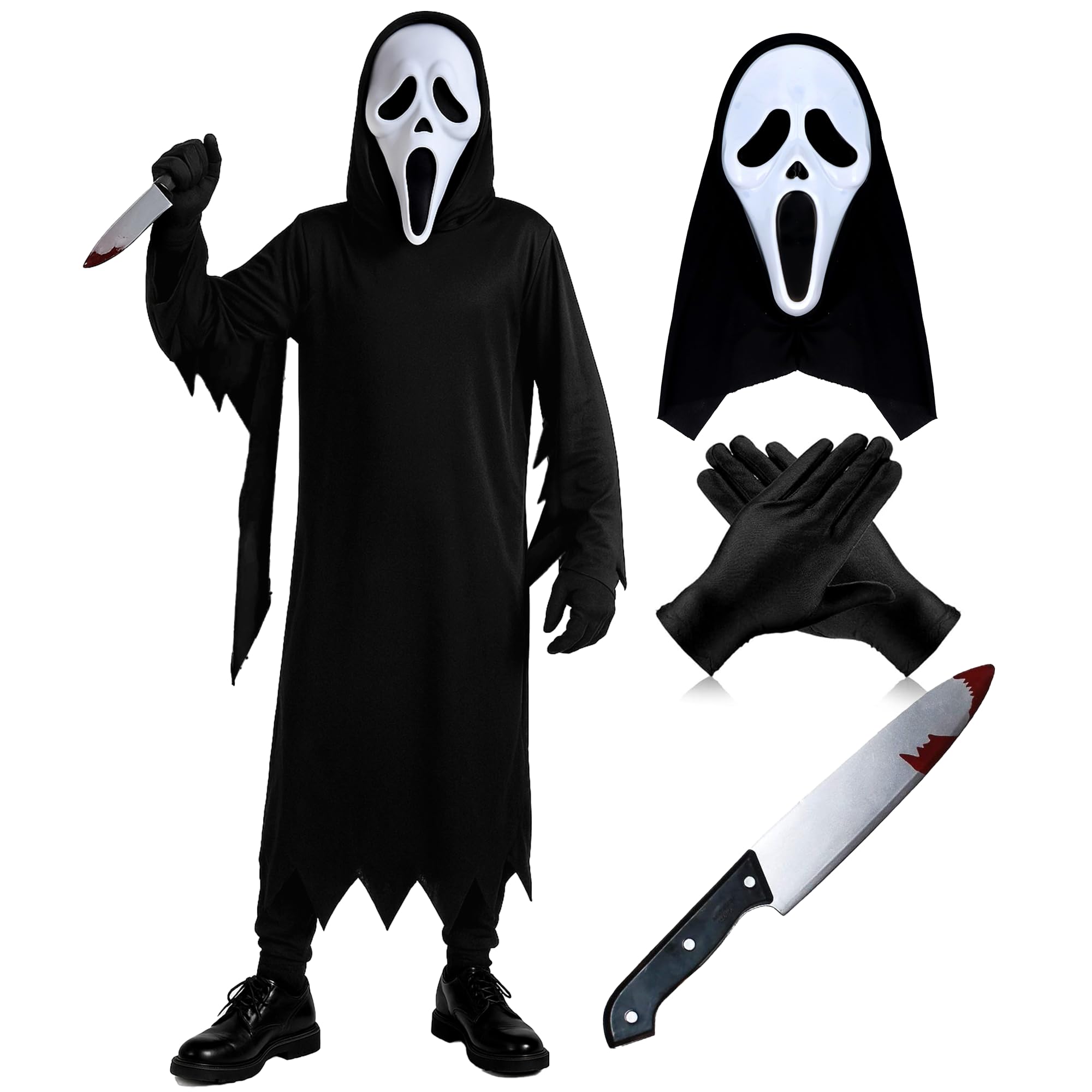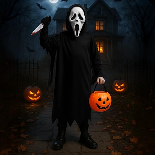 The Fancy Dress Ghost Face Costume Kids 4 Piece Set With Black Hooded Robe And Gloves, Ghost Face Mask & Fake Blooded Knife Prop, Halloween Costumes For Boys 4-12 Years