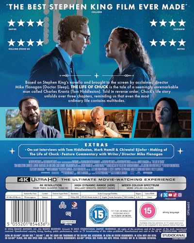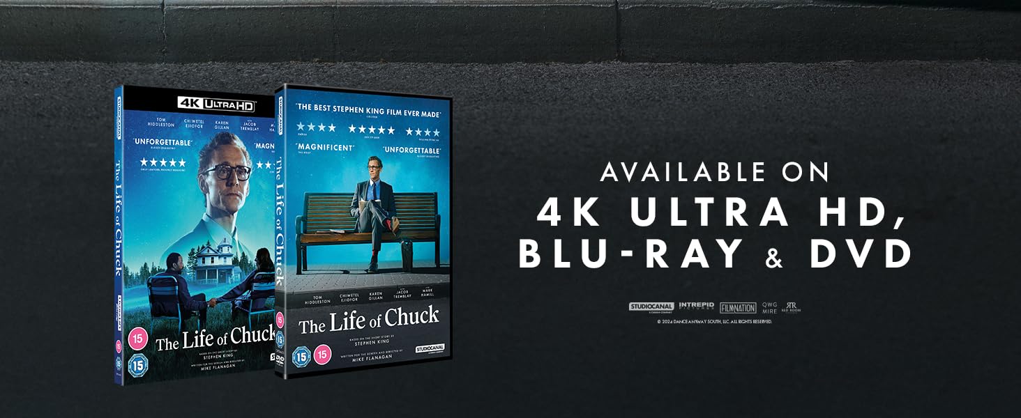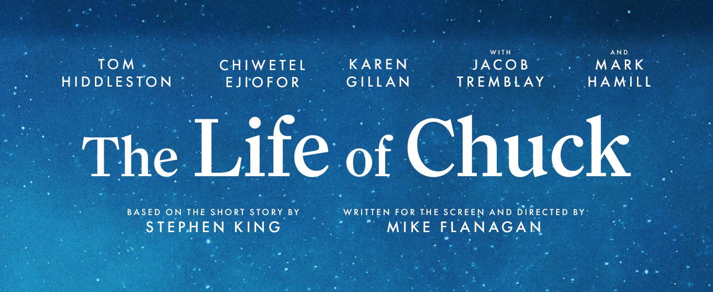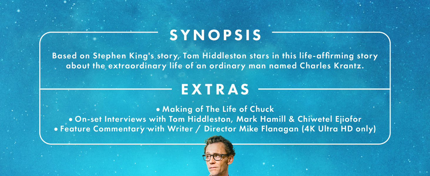 Based on Stephen King’s novella and brought to the screen by acclaimed director Mike Flanagan (Doctor Sleep), THE LIFE OF CHUCK is the tale of a seemingly unremarkable man called Charles Kranz (Tom Hiddleston). Told in reverse order, Chuck’s life story unfolds over three chapters, reminding us that even the most ordinary life contains multitudes.