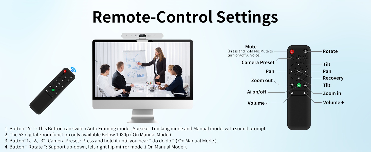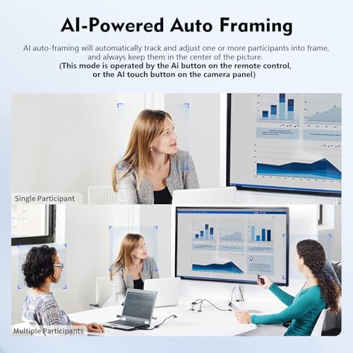 【AI Tracking with Auto-Framing】 AI-powered auto-framing will automatically track and adjust one or more participants into frame and always keep them in the center of the picture. (This mode is operated by the Ai button on the remote control, or the AI touch button on the camera panel)