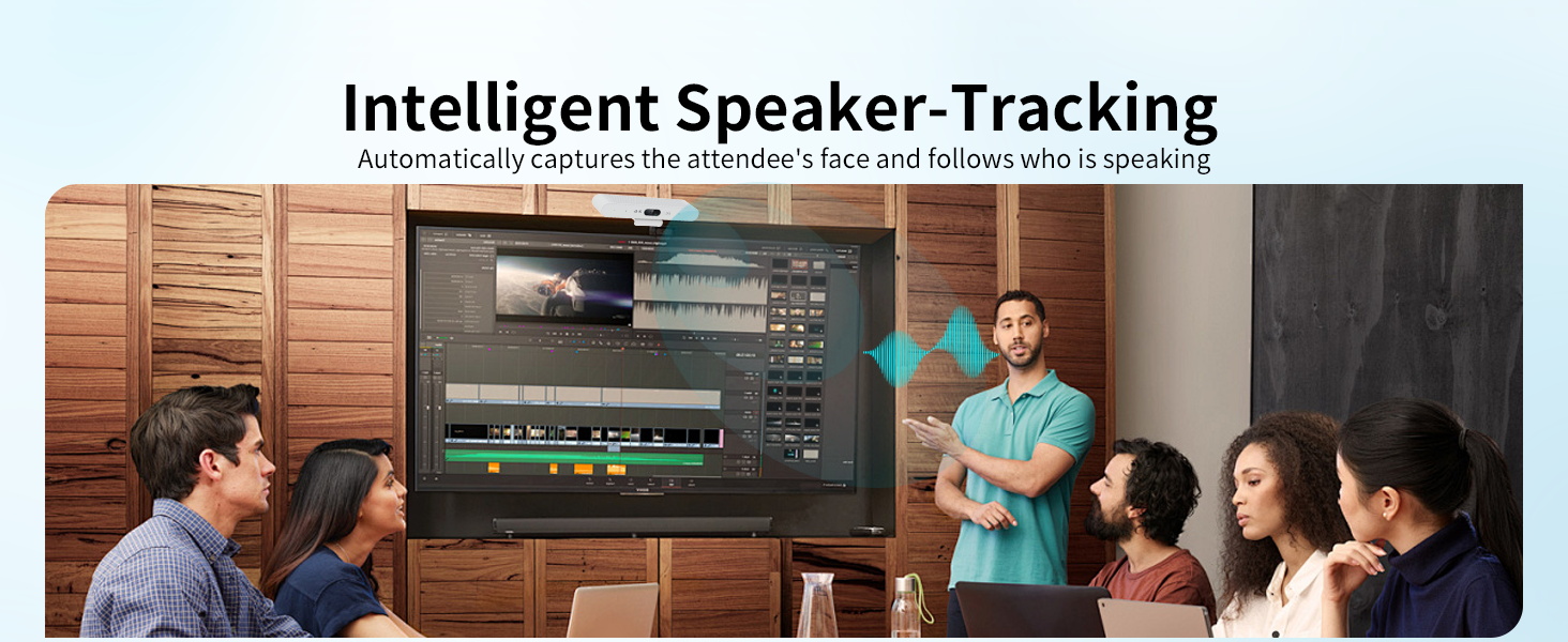 【Advanced Speaker-Following Tech】 Voice Activity Detection(VAD), automatically captures the attendee's face and follows who is speaking in the meeting rooms. (This mode is operated by the Ai button on the remote control, or the AI touch button on the camera panel)