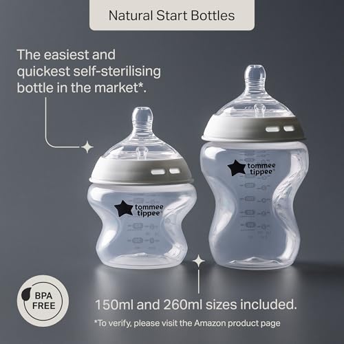 Get everything you need to feed and soothe from birth with this 11-piece bottle feeding and soother set. Feeds are simpler with our self-sterilising Natural Start bottles (#1 for easily switching between breast, bottle and back*). This newborn set gives you 150ml and 260ml bottles, with soft silicone teats in 2 different flow rates to suit baby’s pace, and 2 symmetrical soothers for consistent comfort, any-way-up. • x4 150ml Natural Start Bottles with Extra Slow Flow Teats: For use from birth. 95% of babies accept a Tommee Tippee bottle* • x4 260ml Natural Start Bottles with Slow Flow Teats: Bigger bottles, and teats with a slightly faster flow to suit baby’s changing appetite. • Bottle & Teat Brush: For thorough (but gentle) 360° cleaning that removes all milk residue from bottles before sterilising • 0-2m Newborn Soother: Specially designed to be the perfect fit for tiny, newborn mouths. Made to settle and soothe, from birth to two months • 0-6m Ultra-light StayPut Soother: The lightest one-piece silicone soother*, with a soft, skin-like feel for familiar comfort • BPA-free: Tommee Tippee bottles and dummies for babies are always BPA-free *To verify, please visit the Amazon product page. **Silicone baglet and shield co-bonded with internal PP skeleton to form a single piece soother.