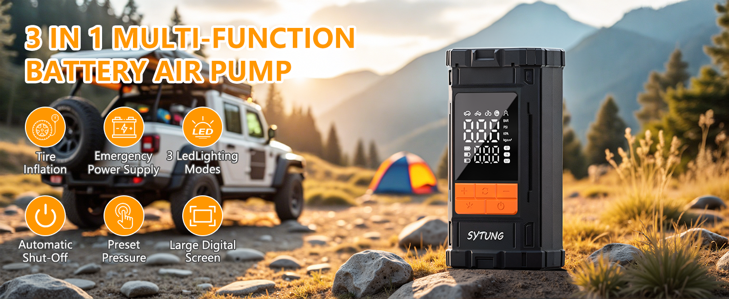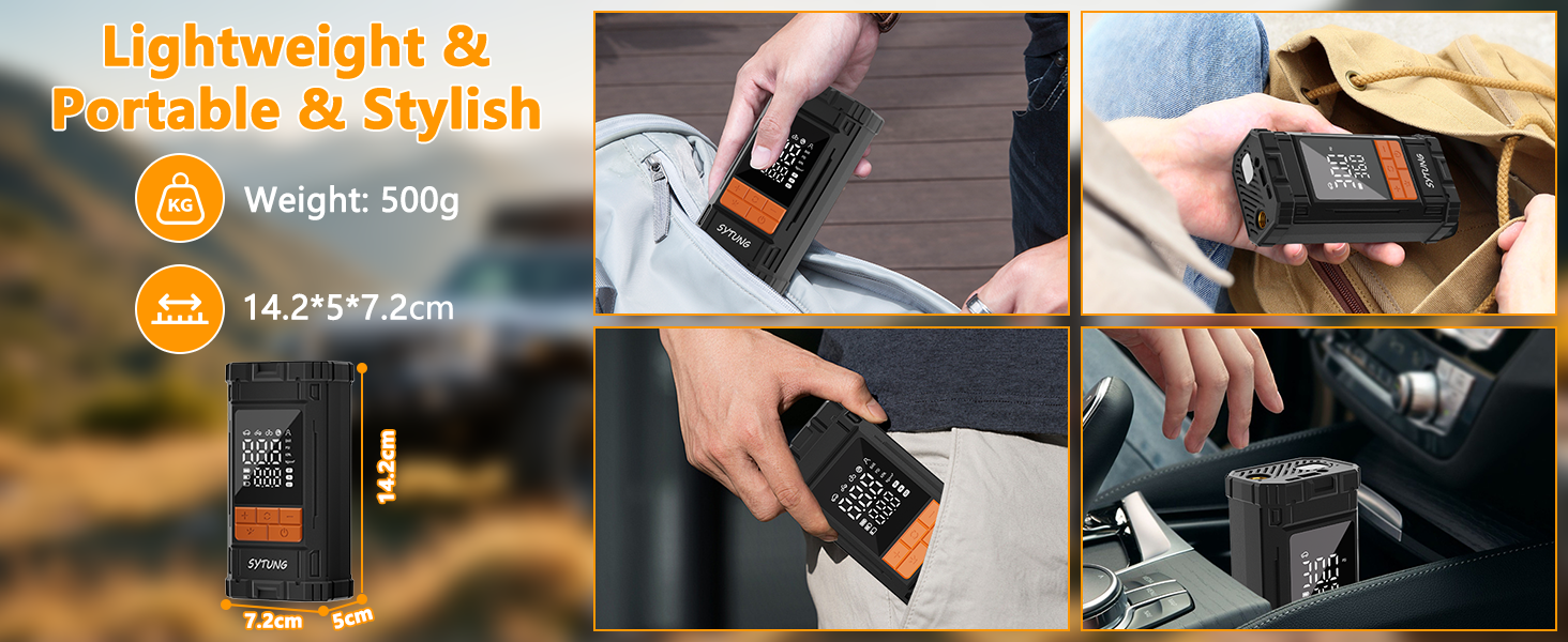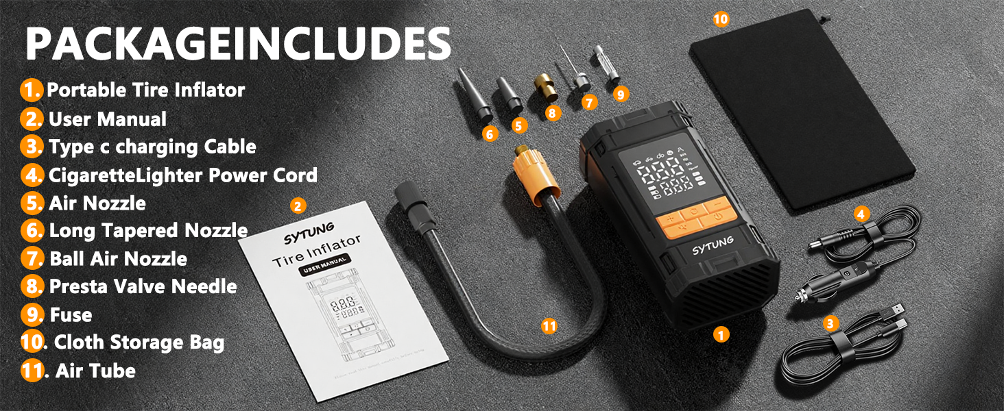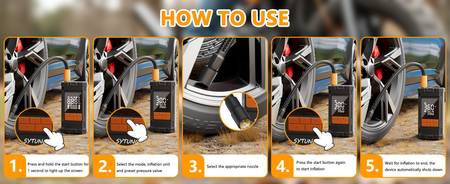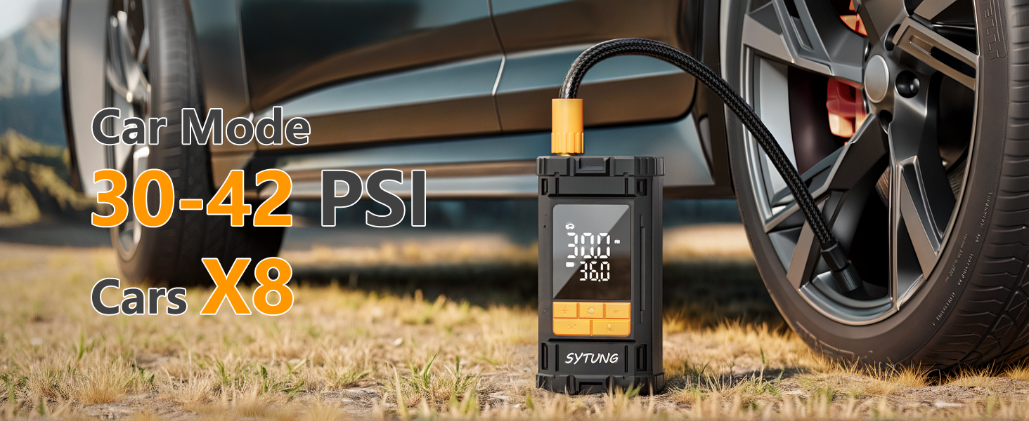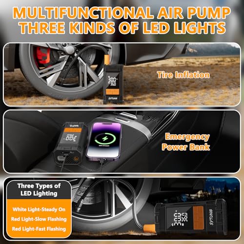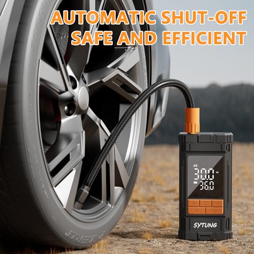 【Fast and effortless inflation】SYTUNG portable tyre inflator air compressor is a powerful device with a that automatically detects tyre pressure when connected to the tyre, sets the required pressure value and stops automatically when this value is reached. Choose from 4 pressure units: PSI, BAR, KPA, Kg/cm². Maximum air pressure: 150 PSI/10.3 Bar.