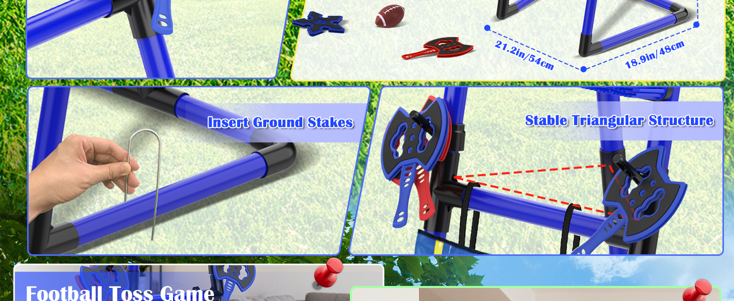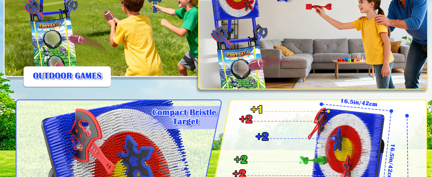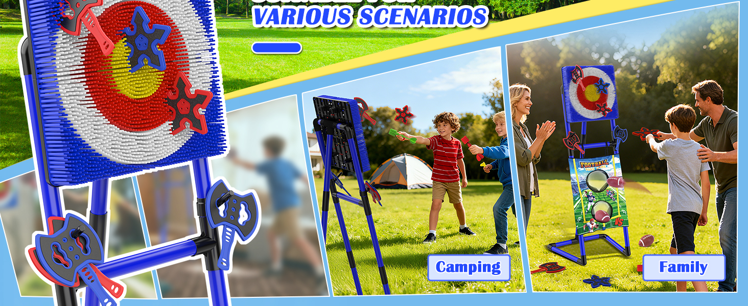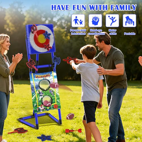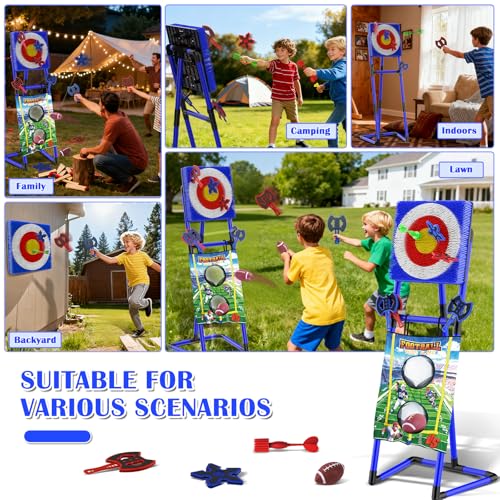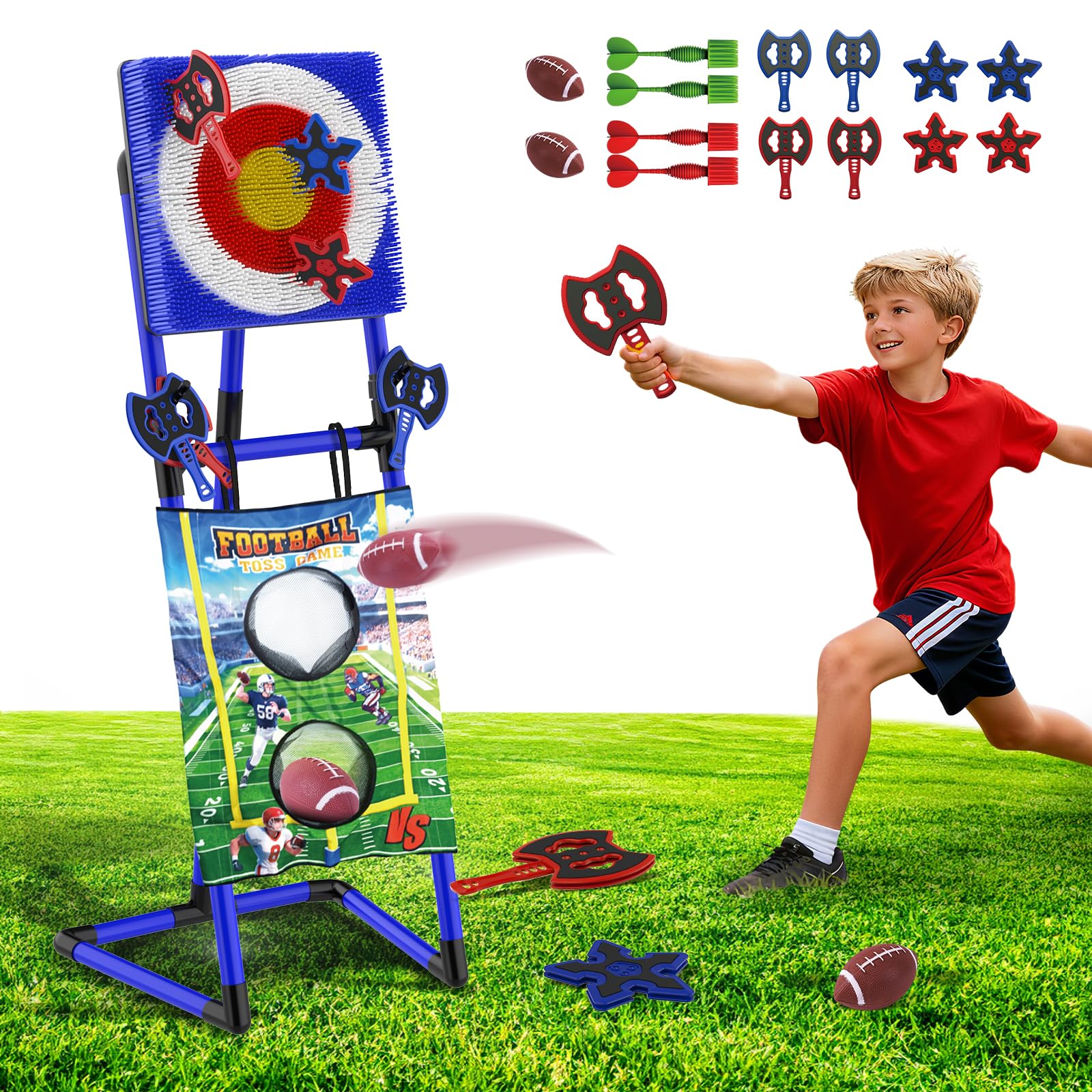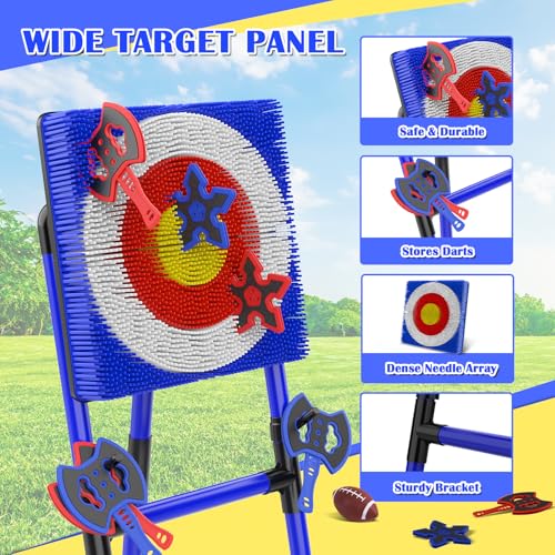 SAFE & STURDY CONSTRUCTION – Designed with reinforced ABS material and a triangular support frame, plus two ground stakes for maximum stability. Prevents tipping during intense play. Features specially designed safe plastic darts and axes to ensure the safety of children.