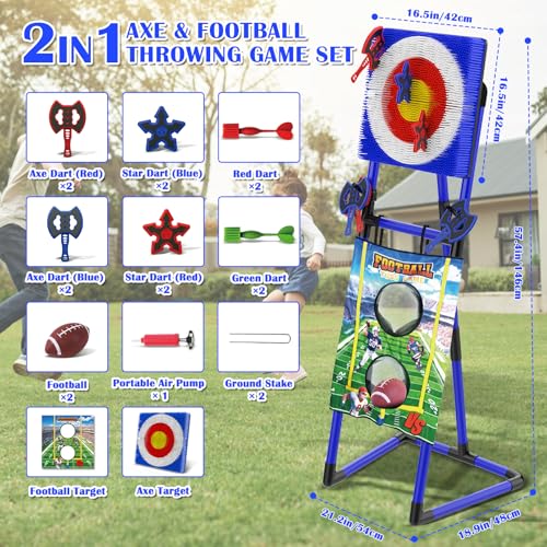 AXE THROWING GAME COMPLETE SET– Everything you need for immediate fun is included: 1 axe target, 1 rugby cloth target, 1 sturdy stand, 4 axe darts, 4 star darts, 4 standard darts, 2 rugby balls, 1 portable pump, and 2 ground stakes. When assembled, the target stands at 57.4 inches (146cm)—the ideal height for an authentic throwing experience, perfect for teens and adults to enjoy together.