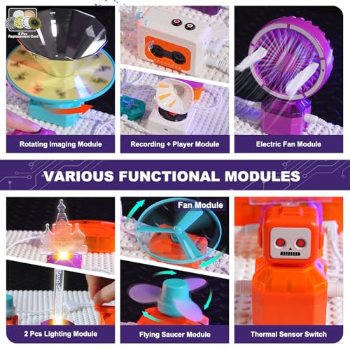 DIVERSE & ENGAGING PLAY THEMES – Go beyond simple circuit board toy! Build an Illuminated Castle, power an Electric Fan, design a flying saucer, record and play back sounds, explore rotational imaging and many more thrilling projects. With a variety of functional modules, smart sensors, and switches, kids stay engaged while discovering real-world applications for their creativity.