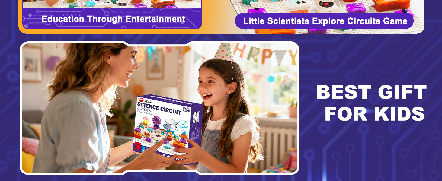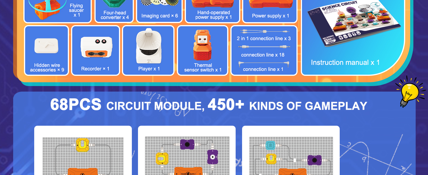 68PCS SCIENTIFIC CIRCUIT SET, 450+ EXPERIMENTS – Spark endless curiosity and creativity with over 450 unique circuit projects! This complete 68pcs electric circuit kit turns learning into an exciting, hands-on adventure, guaranteeing hours of educational fun that grows with your child's imagination.