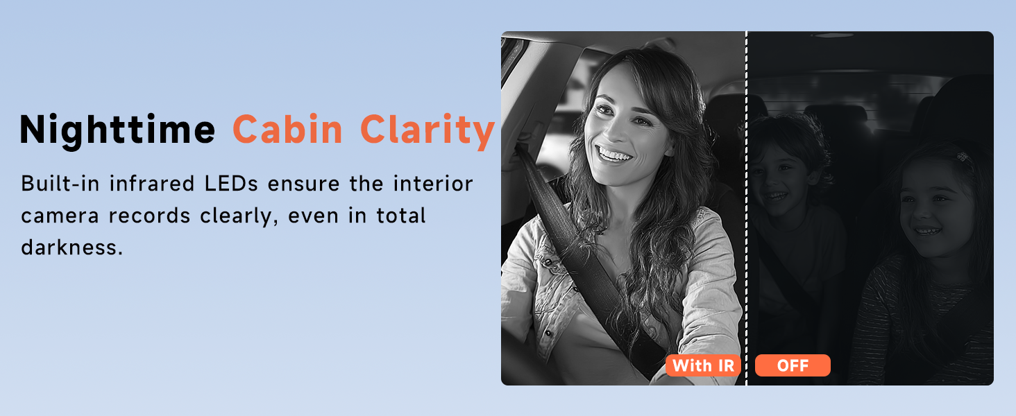 - Superior Night Vision- Drive Confidently, Even in the Dark.- Advanced night vision with infrared LEDs(cabin camera) and a wide dynamic range delivers clear, sharp footage—even in low-light or no-light conditions.