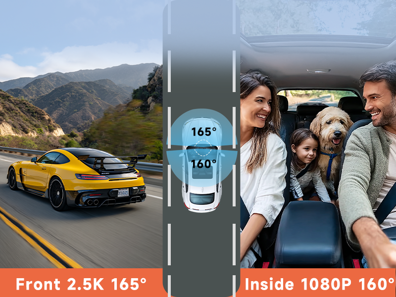 - Ultra-Wide Dual Camera with HD Clarity- See More with 165° Front and 160° Interior Coverage- The front camera captures the road in crisp 2.5K QHD at a 165° angle, while the 160° cabin lens records in 1080P Full HD—covering both outside and inside with no blind spots.