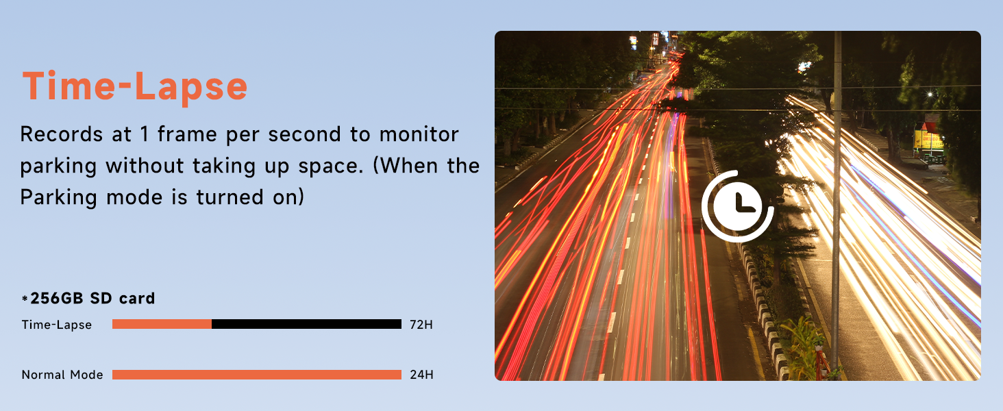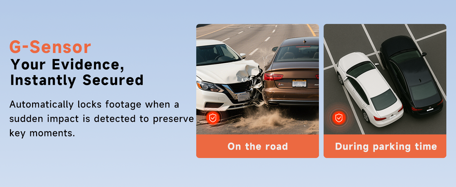 - [G-sensor Collision Detection & 24-Hour Parking Monitor] – This dashcam features an adjustable G-sensor that detects sudden collisions or shaking and locks the footage to prevent overwriting. The 24-hour parking mode enables automatic recording when movement or impact is detected while the vehicle is parked. Time-lapse recording mode helps save storage by recording at 1 frame per second. (Hardware kit not included)