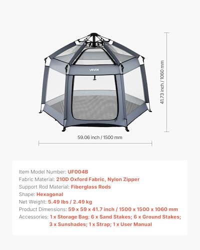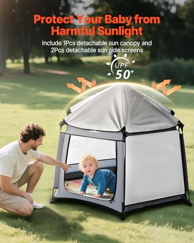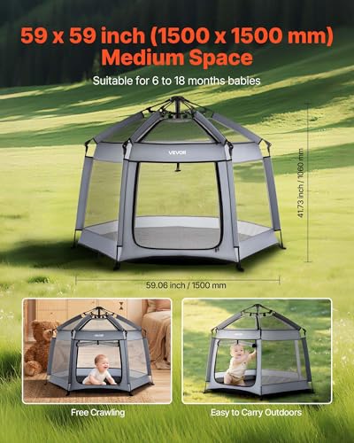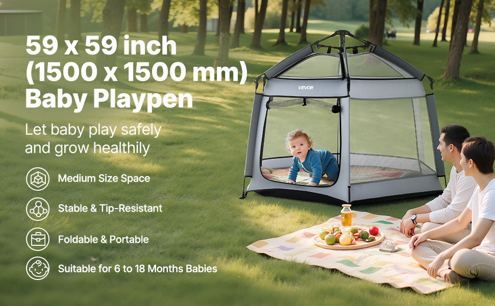 Spacious Playing Space: VEVOR 59 x 59 inch (1500 x 1500 mm) medium-sized baby playpen with canopy — a safe play space for babies aged 0 to 24 months. It gives your little one plenty of room to crawl, stand, practice walking, and play, encouraging healthy development while freeing your hands. Please note: The play mat is not included, please prepare it separately