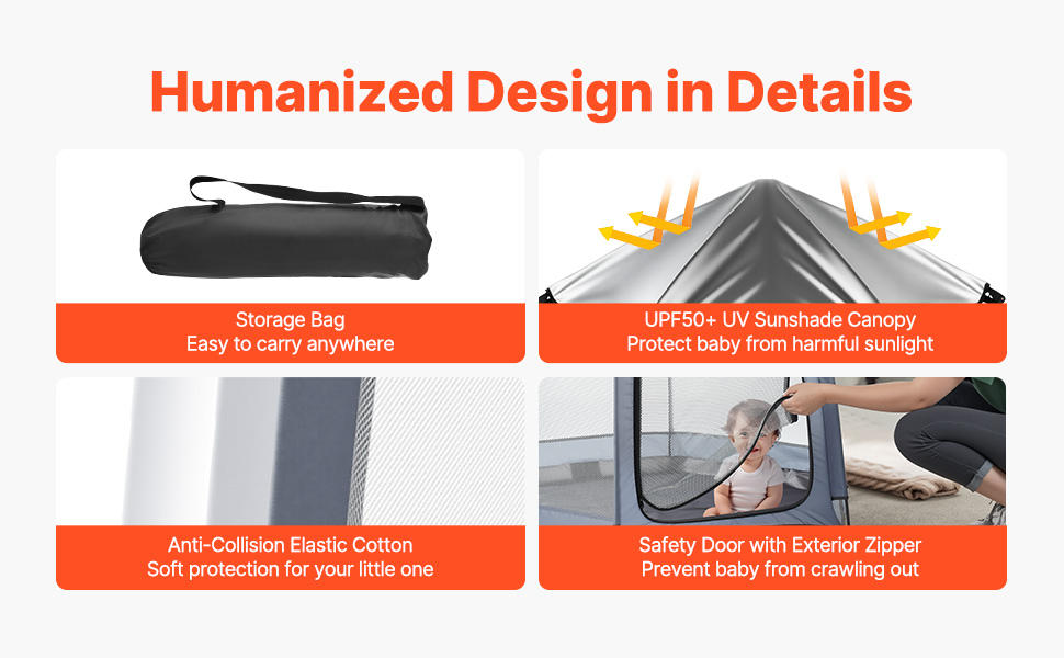 Safety comes first in every detail. This indoor & outdoor baby playpen comes with a storage bag for easy carrying. The anti-collision elastic cotton offers soft cushioning for extra safety. Plus, the safety door with an exterior zipper helps prevent your baby from crawling out.