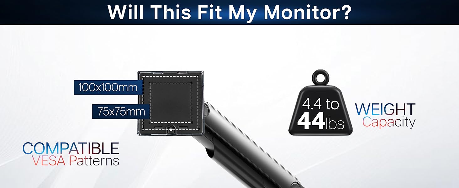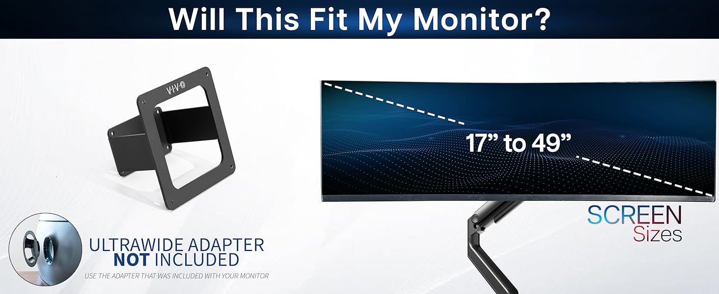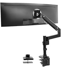 - Fits Ultra Wide Screens: Single mount for ultra-wide monitors up to 49” in size and 44 lbs in weight with 75x75mm or 100x100mm VESA patterns. Stand secures to desks up to 3.2” thick with heavy-duty C-clamp or 1.4” with optional grommet mount