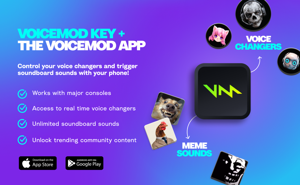 - Seamless console integration – Easy plug-and-play setup for PS5, Xbox and Nintendo Switch 2. Just download the Voicemod app and connect the Voicemod Key to your smartphone and headset to unlock Voicemod's voice distortors and soundboard for your console gaming experience!