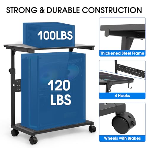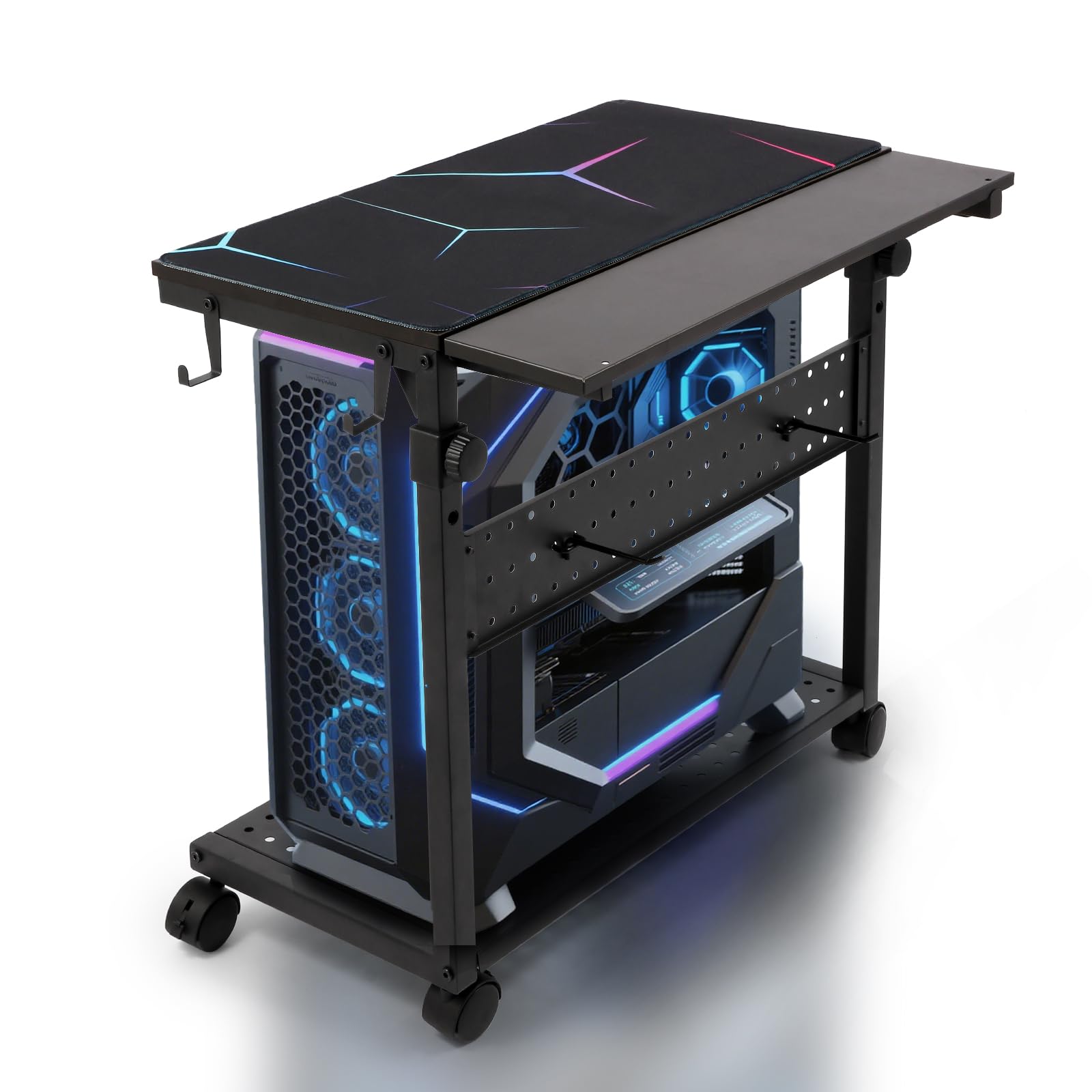 Height Adjustable Computer Wider Tower Stand for Gaming Home Office, 2-Tier PC Stand Printer Rack ATX-Case CPU Holder Cart with Wheels & Mouse Pad, Black