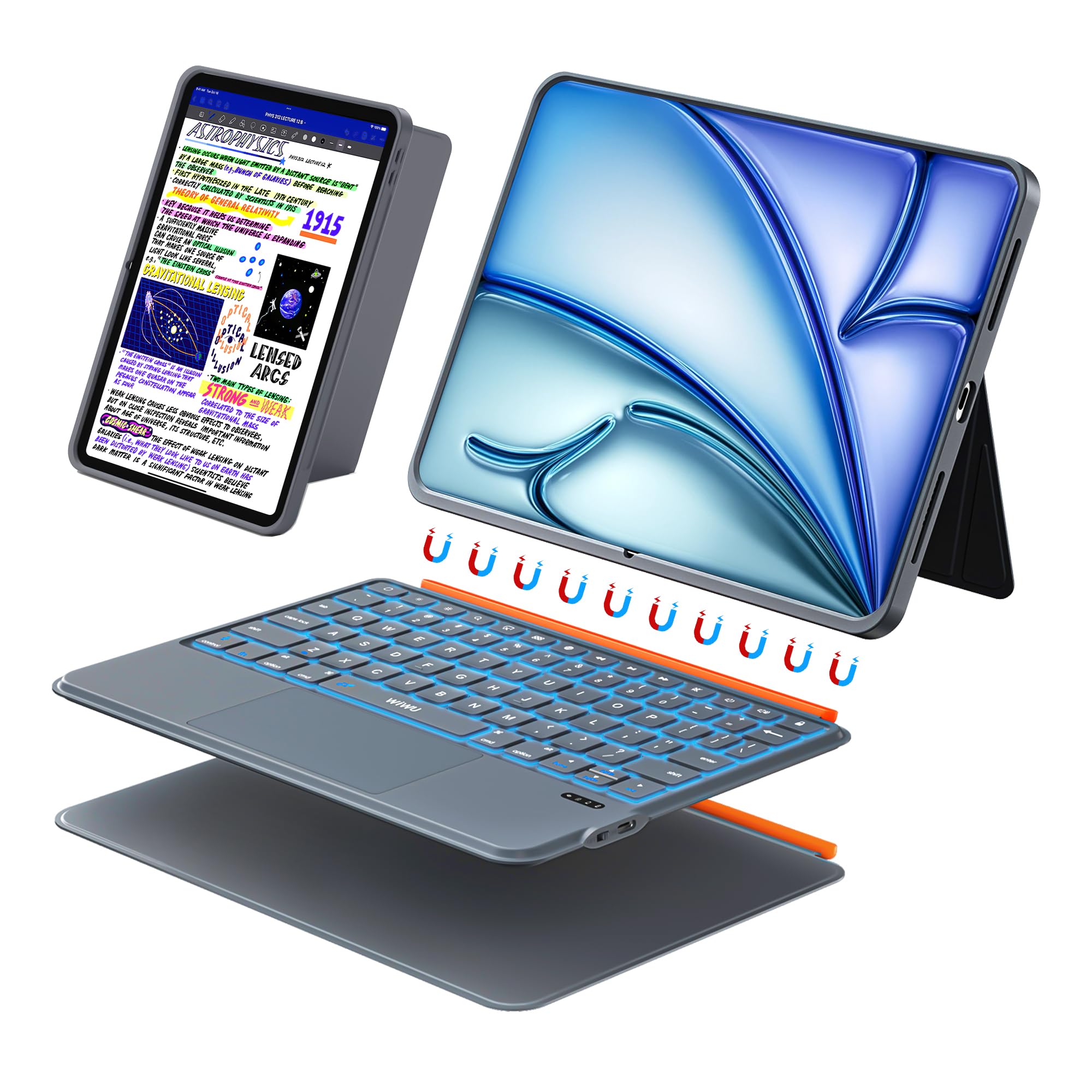 WIWU iPad Keyboard Case 11 Inch A16 11th 10th Gen 3 in 1 Magnetic Detachable Case Keyboard Adjustable Stand Backlit Keys with Touchpad (GREY, For iPad 11/10/Air 5/4/11″(M2/M3) Pro 11″ 4/3/2/1)