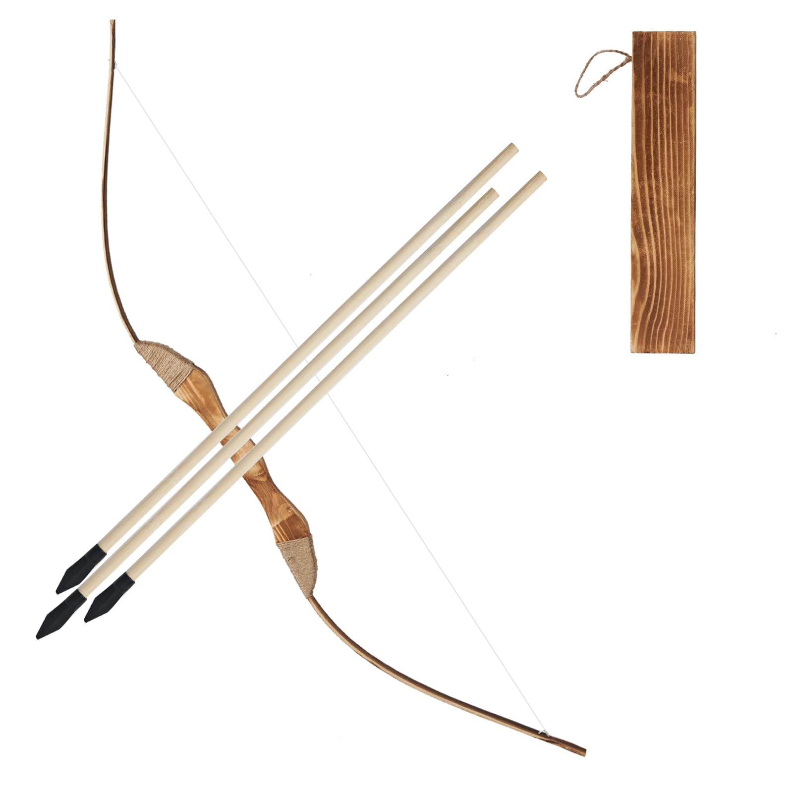 DURABLE WOODEN MATERIAL: Our wooden bow and arrow set is crafted from high-quality natural wood, solid wooden bow riser+bamboo limbs,ensuring durability and safety for long-term use. Each arrow is equipped with a soft, rubber tip to prevent injuries.