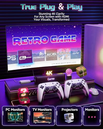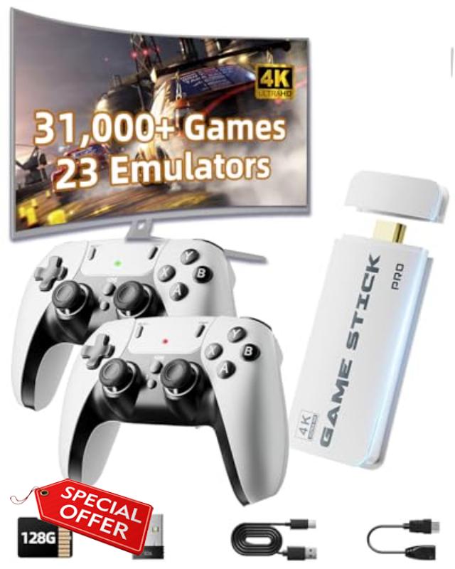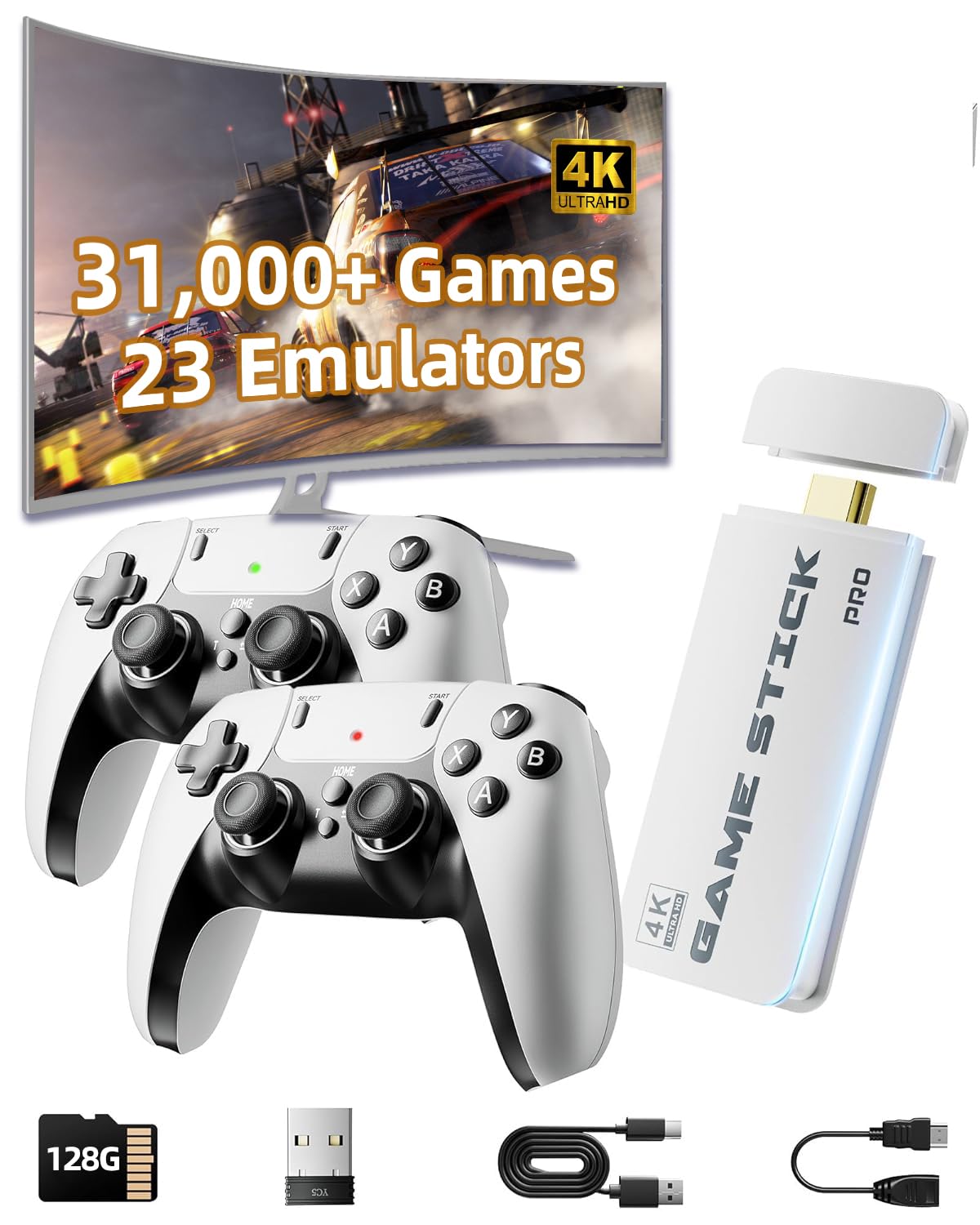 XYELLOWICON Retro Game Console 4K HDMI – 31,000+ Classic Video Games Built-in, Includes 2 Wireless Controllers, Plug & Play TV Stick with 23 Emulators & 128GB Storage