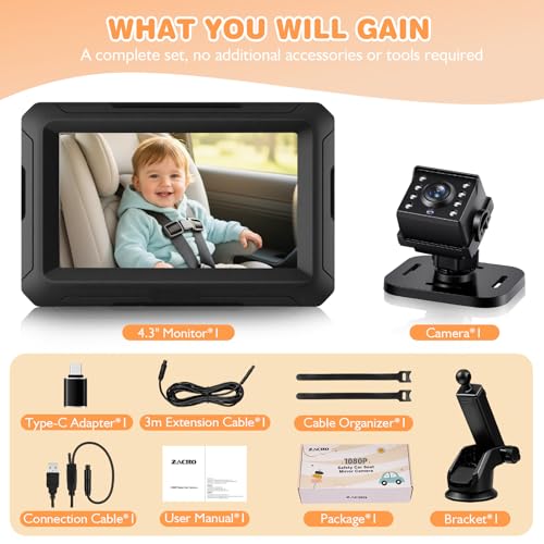 Zacro Baby Car Camera HD 1080P – Baby Car Mirror 4.3'' Display for Rear Seat with Night Vision Function, Wide View Angle, Reusable Sucker Bracket, USB interface