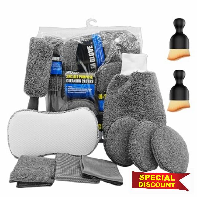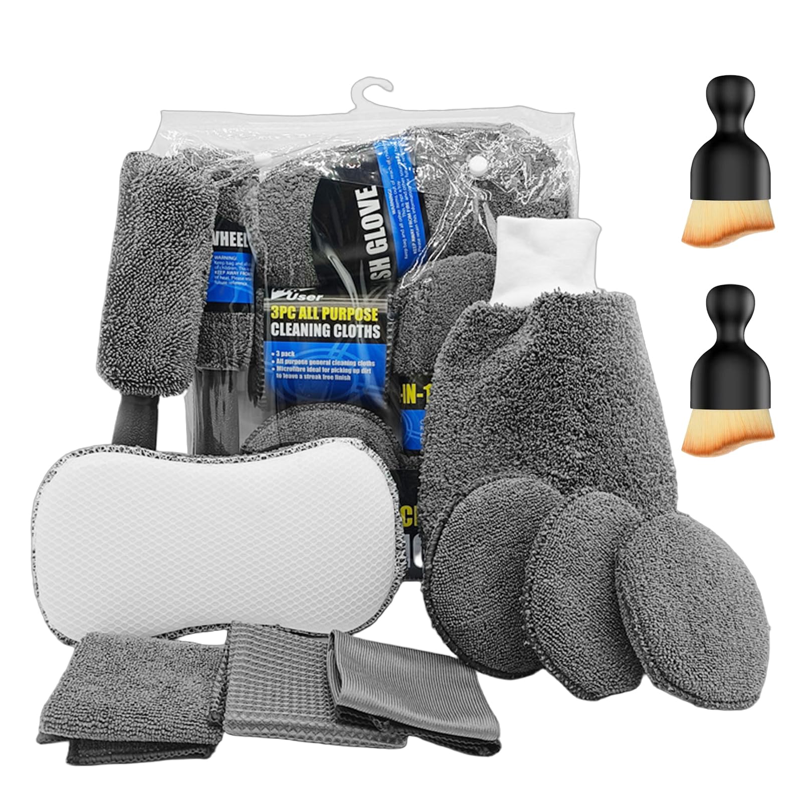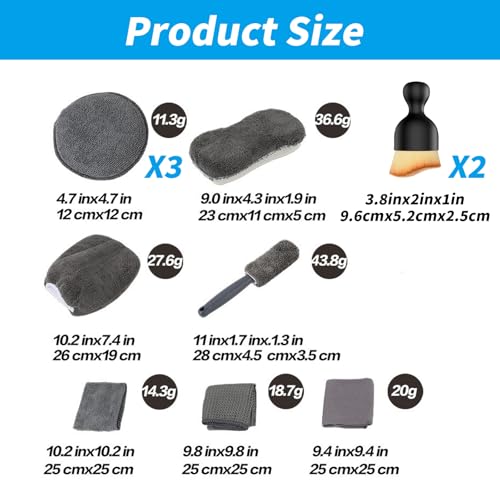 - 【11 Pieces Professional car washing kit】 1 * microfibre car wash mitt, 1 * double-sided coarse mesh sponge block, 1 * waffle towel, 1 * knitted towel, 1 * glass cloth, 3 * polishing pads, 1 * car tyre brush, 2* soft brushes for car interior cleaning, 1 x carrying bag. A complete, fulfilling all your car cleaning needs.