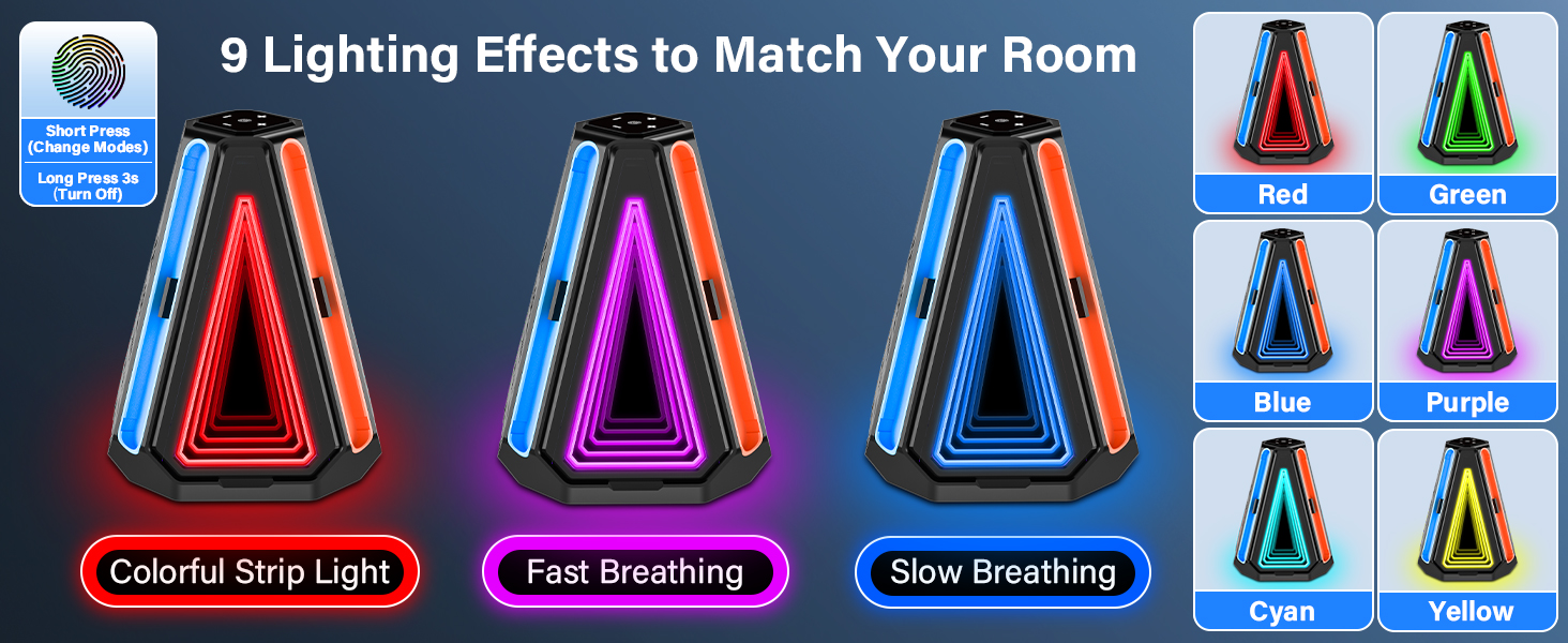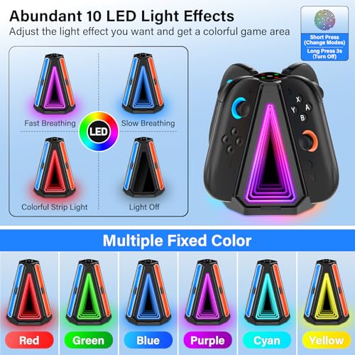 - 10 RGB Light for Joycon 2 Charging Dock: The controller charger for switch 2 joycon has 10 RGB light mode: Dazzling Color Light/Slow Flashing Light/Fast Flashing Light/Light Off and 6 Fixed Colors Mode(Blue/Green/Red/Purple/Cyan/Yellow), which can match your mood or gaming theme to customized, immersive yourself. Press and hold the light adjustment button in 3s to turn off the ambient lights