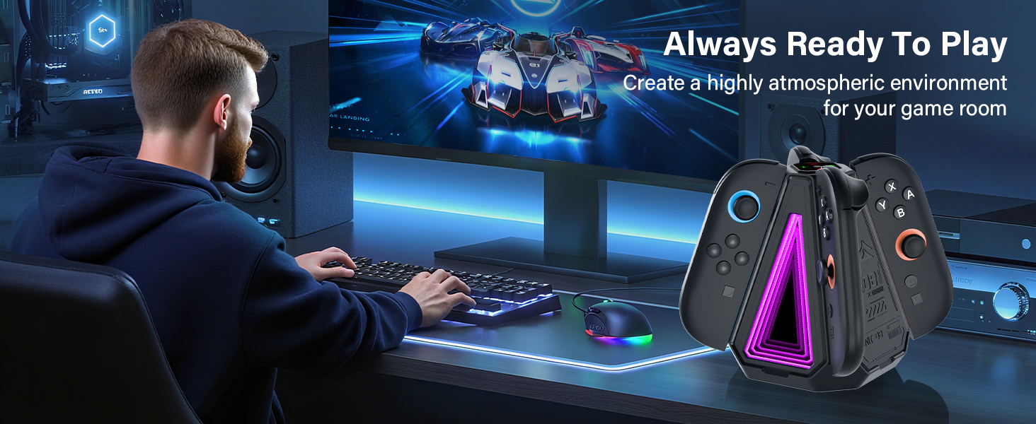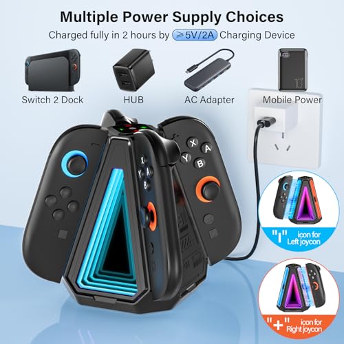 - Powerful Multi-Function Charger for Joy-Con 2: The charging dock for switch 2 Joycon combines stylish ambient lighting, charging function, and storage into one versatile device, significantly expanding the capabilities of a switch 2 charger. It not only charges Joy-Con but also stores them, helping to save space in your gaming area. WHAT YOU GET: 1x Controller Charger, 1x 80 m Type-C Cable, 1x User Manual