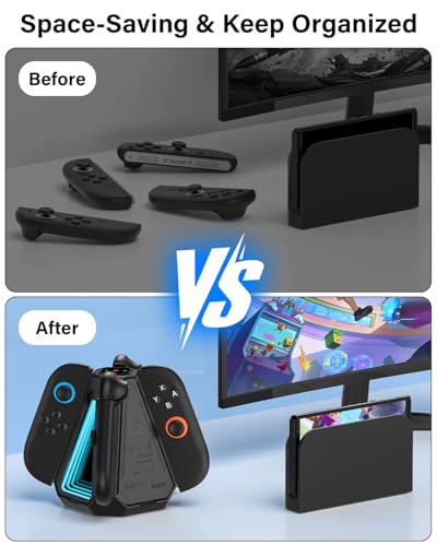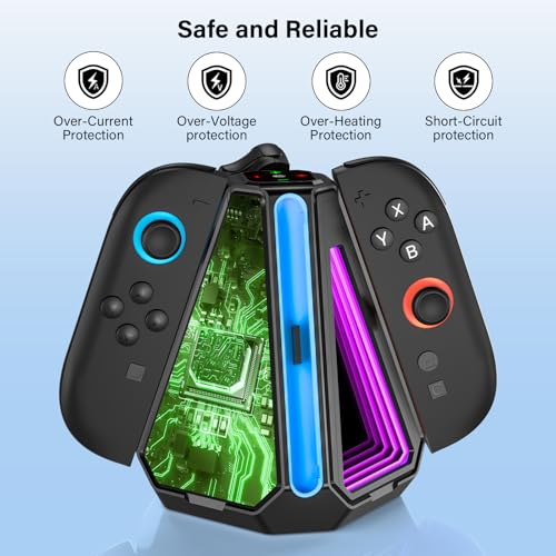 - Safe Charging & Reliable Switch 2 Charger Dock: The charging dock for switch 2 has a built-in safety intelligent chip that gives the charging station a multi-layer protection that prevents the Joycon from overcharging, over-heating, over-voltage, over-current and short-circuit problems, which can effectively extend your life of your joycon