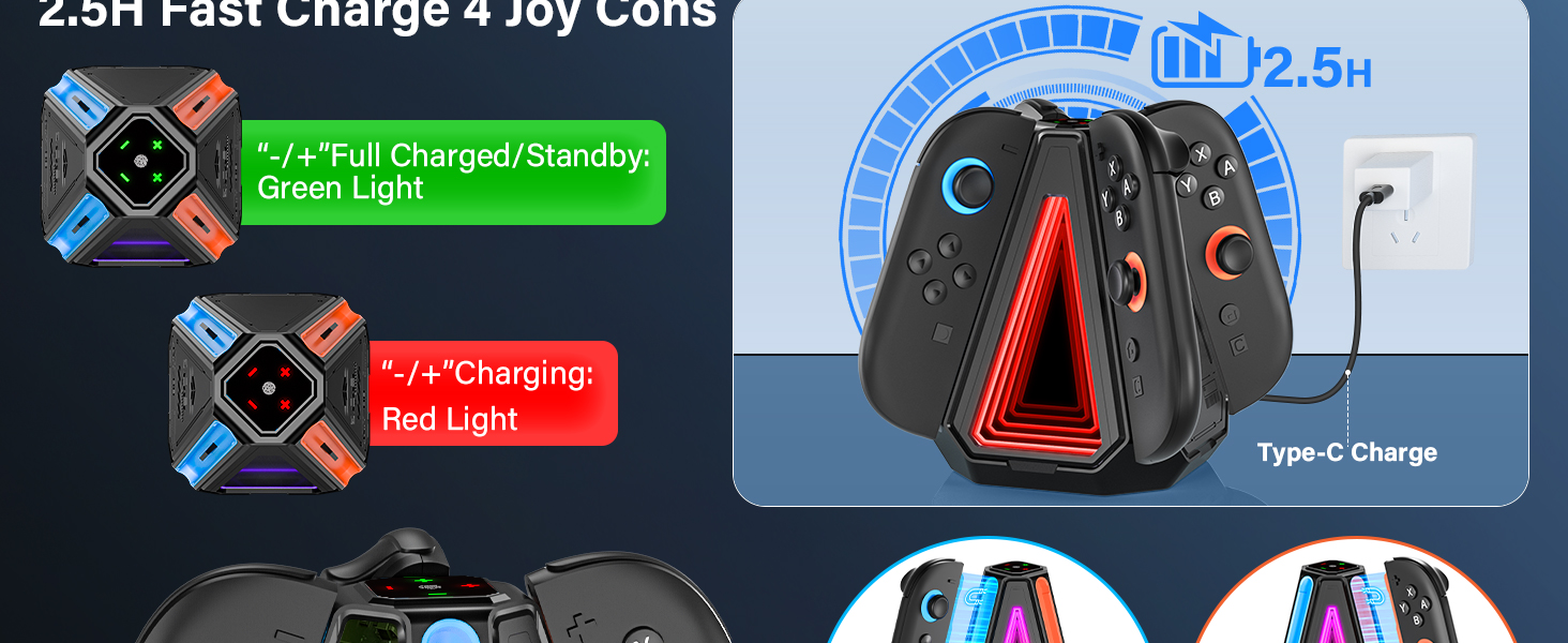 - 2.5H Fast Charging Dock for Switch 2 Joy-Con 2:This charging dock for switch 2 controllers adopts the latest high-speed charging technology, which can quickly fully charge 4 joycons in just 2.5 hours. The joycon charger is easy to use, just put your Joy-Cons into the charging dock and plug the cable into any USB port—it will starts charging right away (The output power should be≥5V/2A)