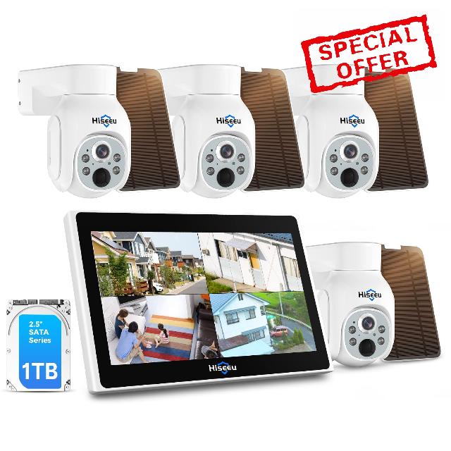• 10CH Monitor & 1TB Hard Drive — Hiseeu cctv camera systems solar powered with a 10" HD 10CH monitor, talk to the people via the monitor directly.The included 1TB hard drive provides ample storage of video footage and makes it easy to back up recordings on your computer.(The solar cameras don't support 24/7 recording)