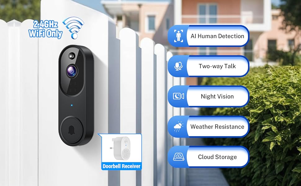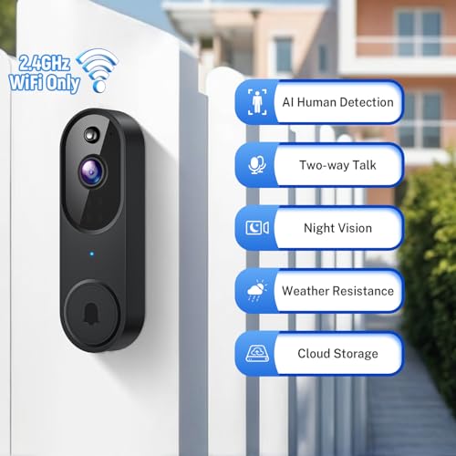 1080p Smart Video Doorbell Camera Wireless, AI Human Detection and Instant Alerts, 2-Way Talk, Night Vision, Cloud Storage, 2.4G Wi-Fi, Battery Powered