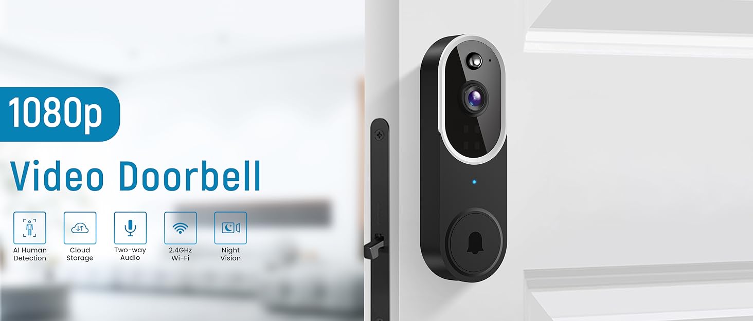1080p Wireless Video Doorbell + Indoor Ring Chime, Enhanced Security with AI Human Detection, 2-Way Audio, Night Vision, AES-128 Cloud Storage, Real-Time Alerts, 2.4Ghz Wi-Wi Only (Black)