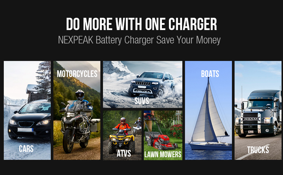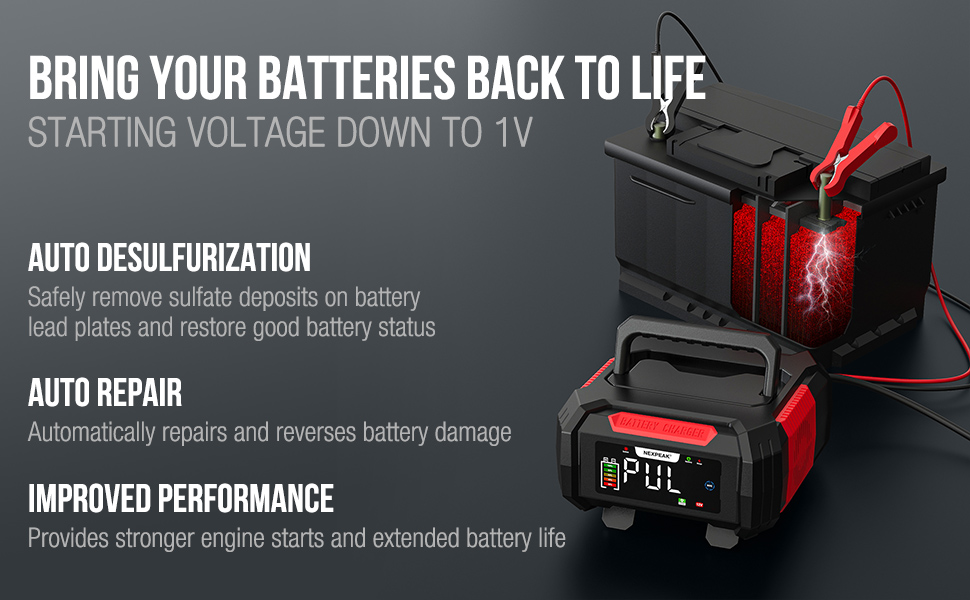 - 【VERY EFFICIENT PULSE REPAIR】12v battery charger automatically detects battery sulphation and acid stratification and uses the latest pulse repair function to restore lost battery performance, providing stronger engine starting and longer battery life. Note: Totally discharged batteries cannot be activated or charged.