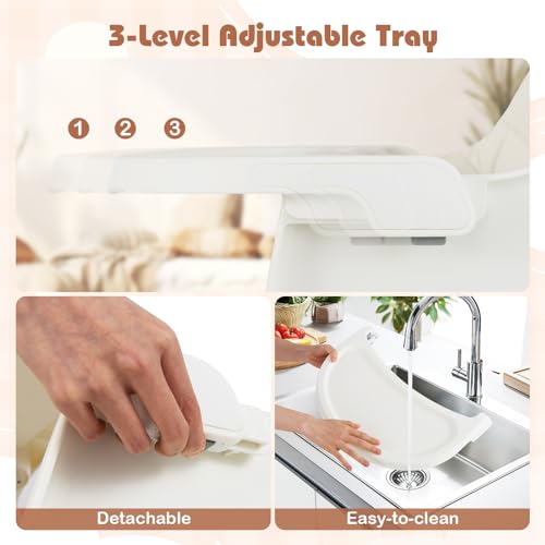 Adjustable & Cozy Design: The removable tray is designed with 3 adjustable positions for ample sitting area for kids of different ages. 3-level adjustable height makes the high chair suitable for various table heights. Moreover, the skin-friendly padded seat cushion brings your child optimal comfort.
