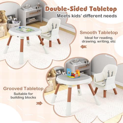 Double-sided Tabletop: The 2-in-1 kids table has a double-sided tabletop (the smooth whiteboard or grooved tabletop) for different activities. It is perfect for writing, drawing, reading, doing crafts, building blocks, and more.