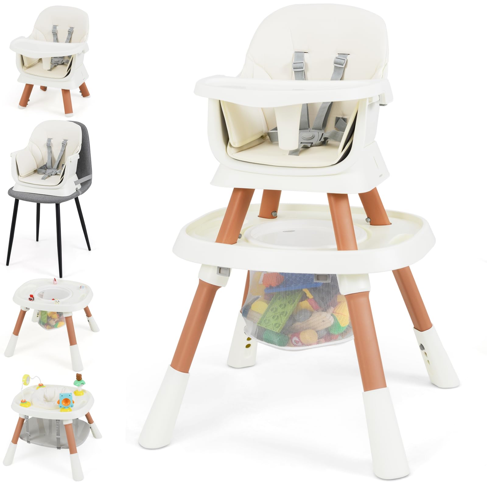 The convertible high chair can be used as a small dining chair, booster seat, toddler booster, small stool, study table & chair, building block table & chair, assistive standing chair, toy storage, or activity center, etc.