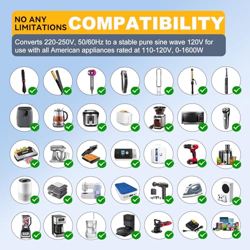 - Voltage Converter 220 to 110: Converts 220-250V down to a stable 120V pure sine wave, Power Any U.S. Appliance (110-120V, 0-1600W) Abroad in 220-250V Countries, such as CPAP machines, hair straighteners, curling irons, hair dryers, coffee makers, blenders, electric toothbrushes, and any home and kitchen appliances.