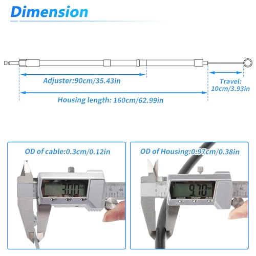 [Extended & Adjustable Length] Housing length: 160cm/66.99in ; Adjuster: 90cm/35.43in, Travel: 10cm/3.93in, OD of cable: 0.3cm/0.12in, OD of Housing: 0.97cm/0.38in, Adjustable design of the middle section achieve length of 3.17cm/1.25", 1 1/4" to provide extra length. With this cable to satisfy the tactile connection of the rider and motorcycle, smoothly change the gear from start