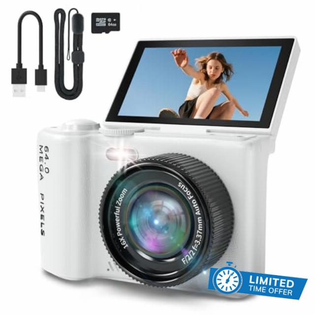 Ultra HD 4K 64MP digital camera: 4K ultra HD digital camera digital video camera for filming is equipped with 64MP ultra-high pixel sensor, which can accurately capture both natural landscape and emotional close-ups with professional image quality, making them the best cameras for content creators. Anti-shake technology can also provide stable film level images during hiking adventures. Compact digital camera with flash can add light to you, capture the darkness, capture your most beautiful moments.